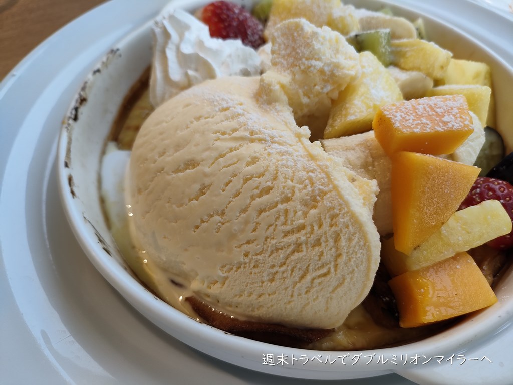 焼き立てのフレンチトーストの上にたっぷりのフルーツ、そして冷たいアイスクリームとコントラストが効いています。アイスクリームは溶けてしまう前にと先に完食。なめらかで濃厚なアイスクリームは美味しく驚くもの。