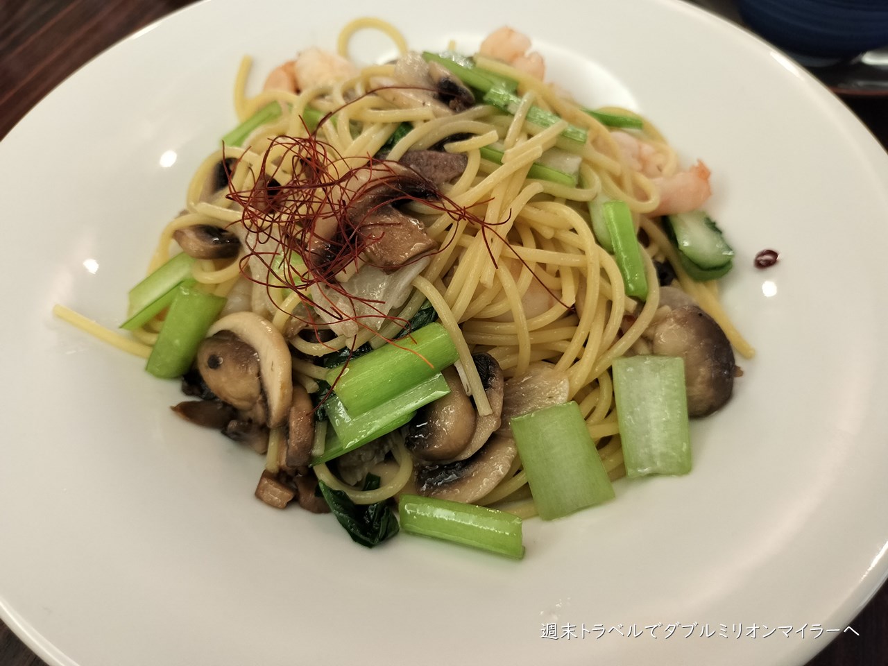 エビのオイルパスタ。大振りのエビがたっぷり入った塩ベースのパスタ、唐辛子とニンニクの香りが効いていて食欲そそるお味。
