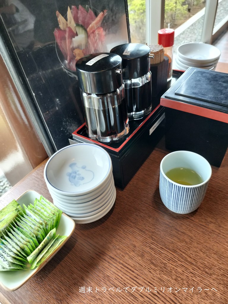 テーブルの上には、わさびとガリ、回転寿司店のような配置です。
