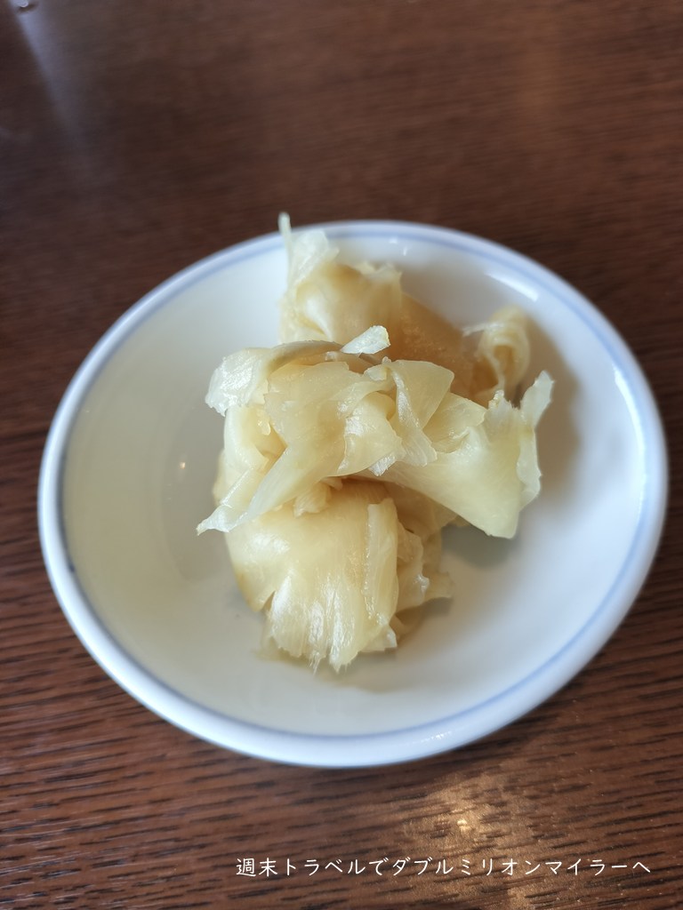 テーブルの上のガリをつまみながらお料理が到着するのを待ちます。ガリは辛味のつよい甘酢漬け、刺身のアクセントにはぴったり。