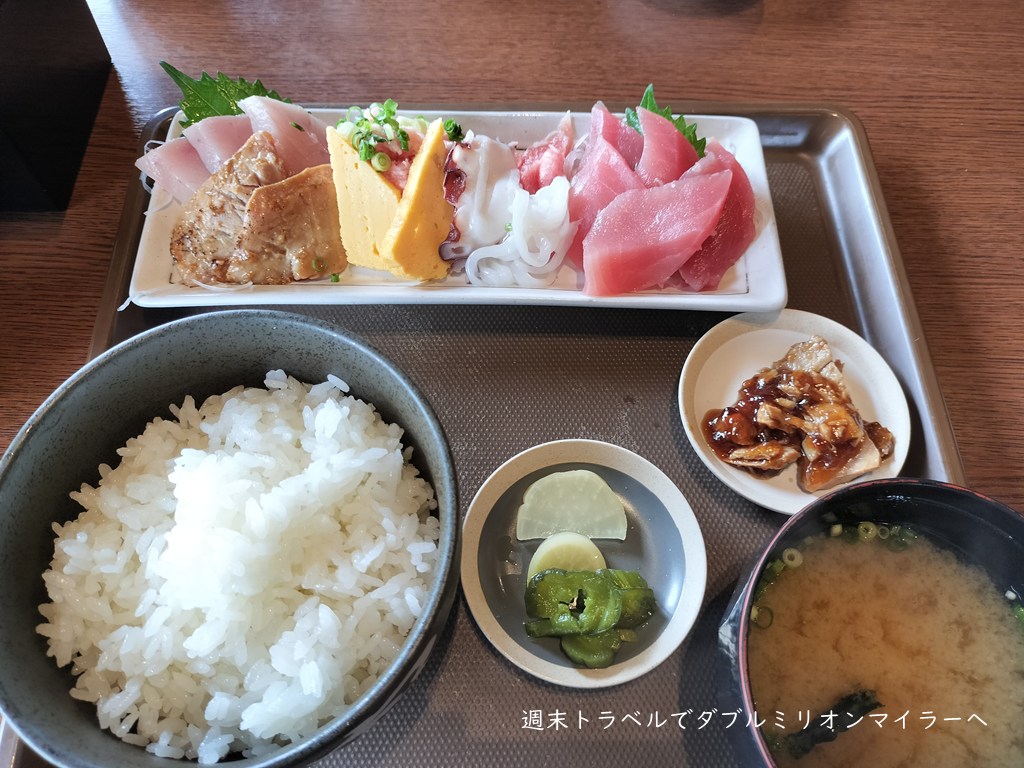 妻は刺身定食にしました。刺身の他にご飯、香の物、鮪の煮つけ、味噌汁がついています。