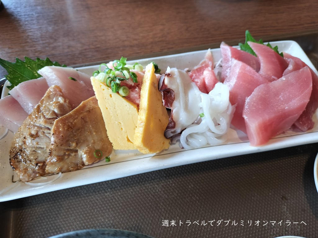 刺身は、びんちょうと赤身のまぐろ、そして、炙った鮪、ネギトロ、たこ、いか、たまごが盛り付けられています。