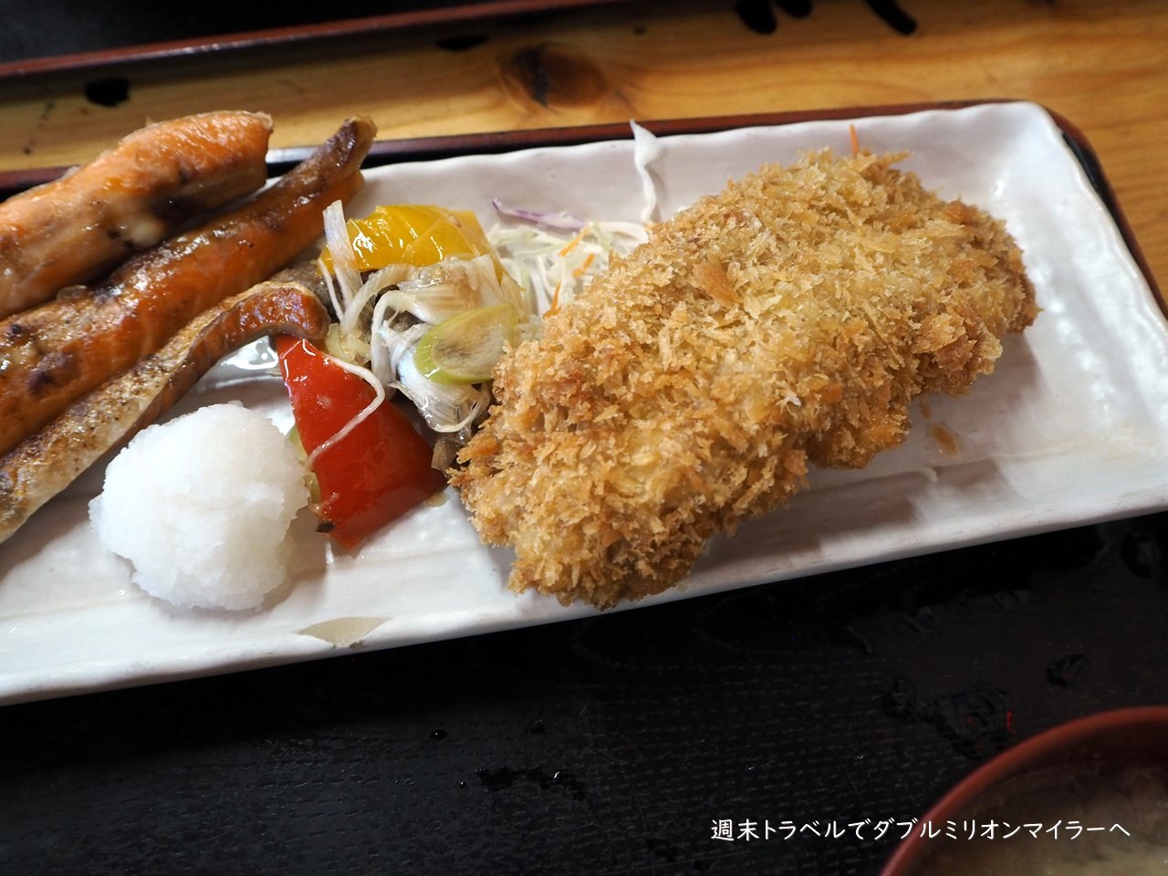妻は、メニューを見た瞬間に即決したもの。あじのたたき丼に鮭ハラス焼き、いわしフライの組み合わせ、あら汁付きです。