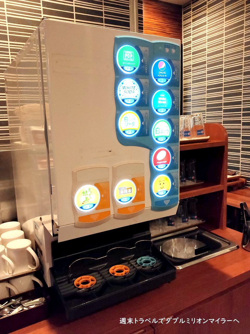 ファミリーレストランのドリンクバーで見かけるタイプのマシン、ソーダ類のファンテンのほか、烏龍茶、オレンジジュースなどがいただけます。
