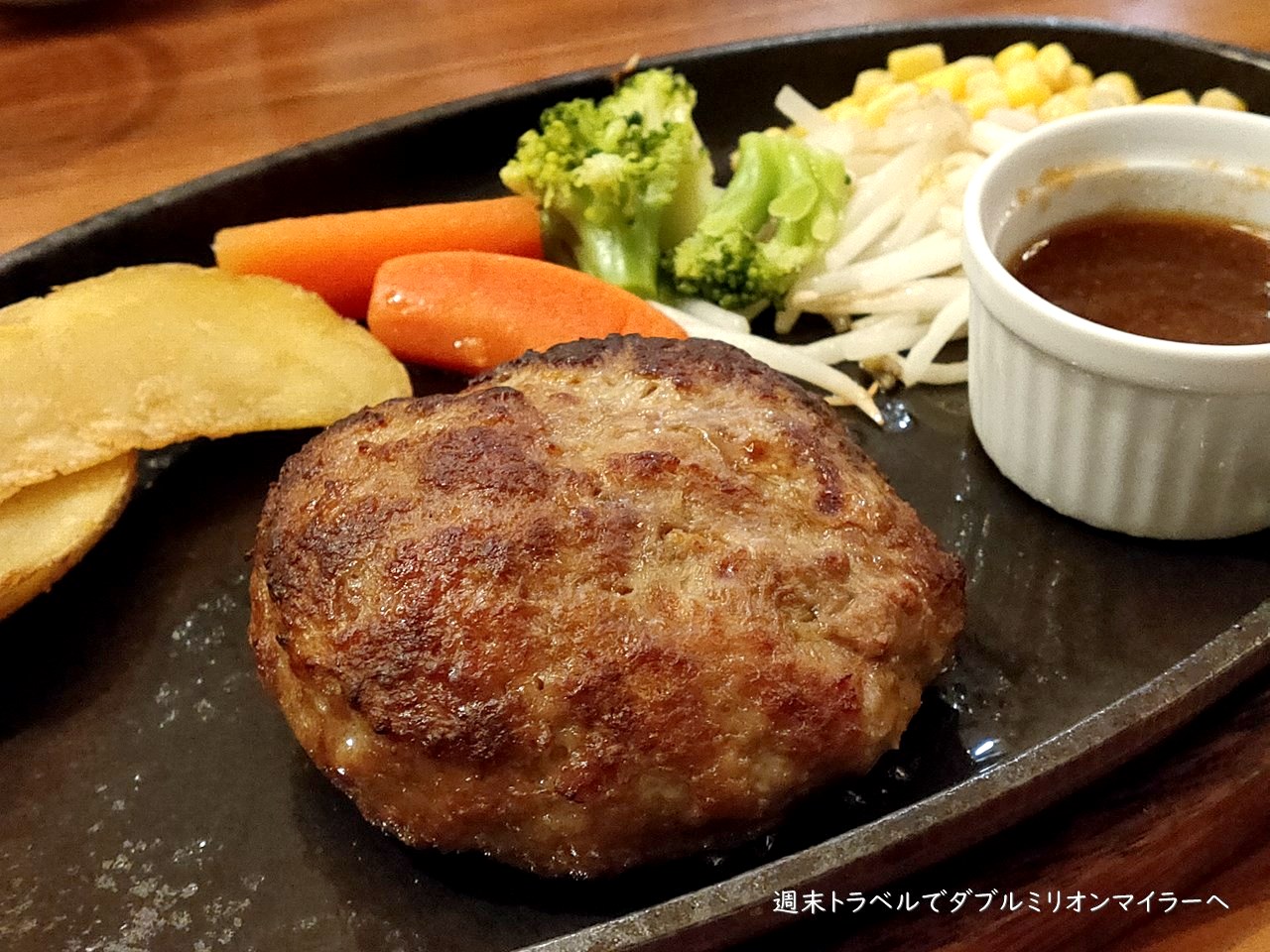 鉄板に乗って供されました。付け合わせは、フレンチフライ、にんじん、ブロッコリー、もやしにコーンと彩りがきれい。