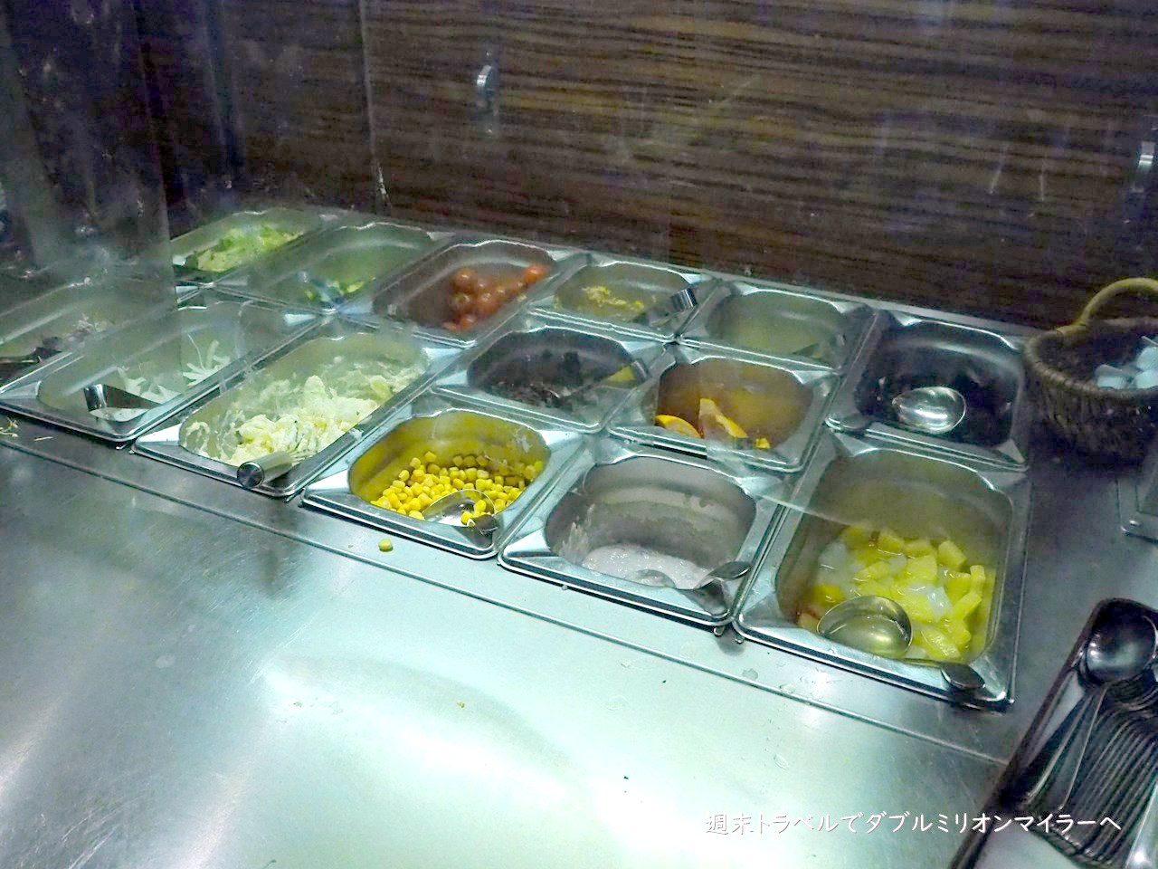 サラダバーは、毎回同じラインナップ。サラダは、レタス、トマト、キュウリ、海藻、玉ねぎ、コーン、ツナ、ポテトサラダと定番メニュー揃い。フルーツは、パイナップル、グレープフルーツ、そのほか、フルーツカクテルとゼリー類があるという組み合わせです。
