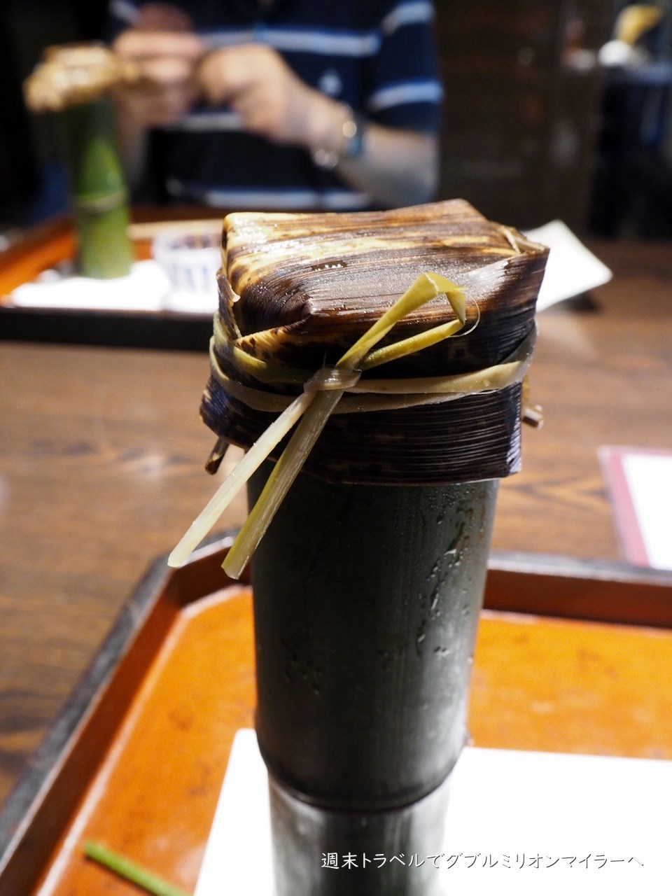 竹の筒に入ったお料理、蓋を取ってかき混ぜながらいただくものとのこと。
