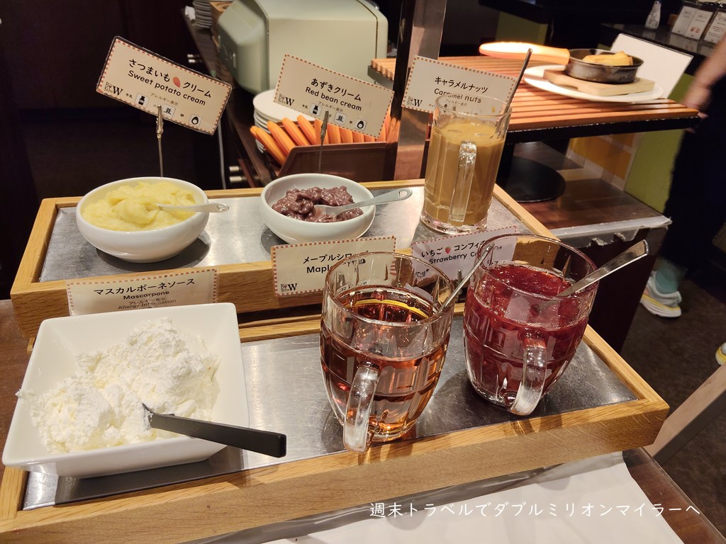 夫はメープルシロップをたっぷりかけて甘くして楽しみ、妻はあずきとさつまいもで和風の味わいを楽しむなど、自由度が高いのがよい点。朝食というよりも「デザート」です。