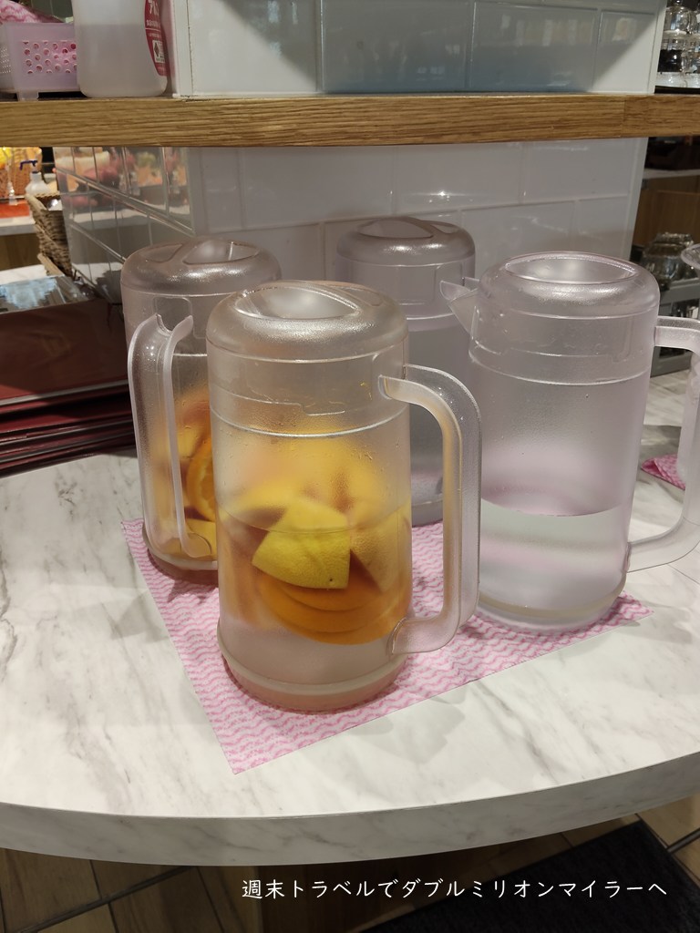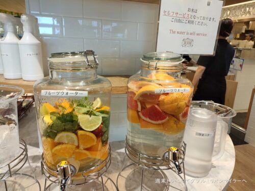 オーダーを終え、セルフサービスのお水をもらいにいってきました。グレープフルーツとオレンジの入ったフルーツウォーターがあったので、これをいただきました。以前はもう少し華やかなフルーツウォーターのタワーがあったのですが、変わってしまって残念。