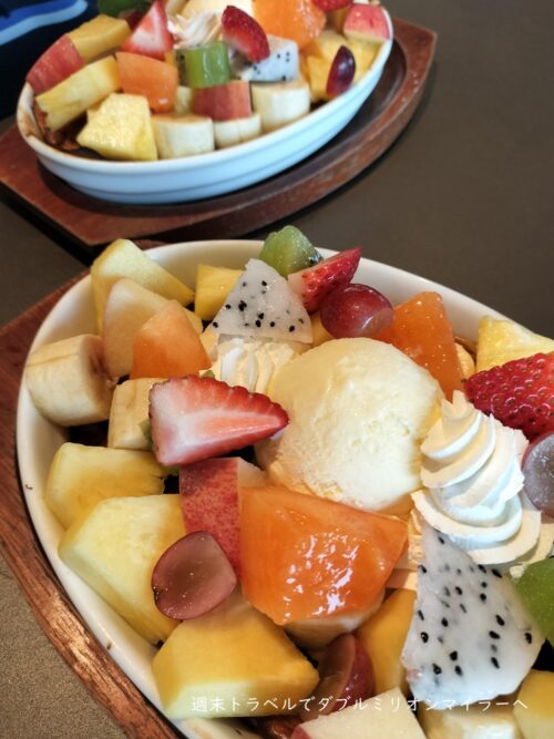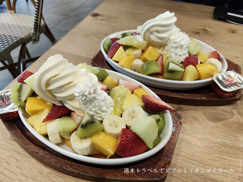 大振りのフランスパン2切れを卵液に浸しオーブンで焼き上げられたもの、乗っていたフルーツは、いちご、バナナ、メロン、キウイ、パイナップル、マンゴーの6種類。いつもよりも種類は少な目ですが、盛り付けのボリューム感は変わりません。