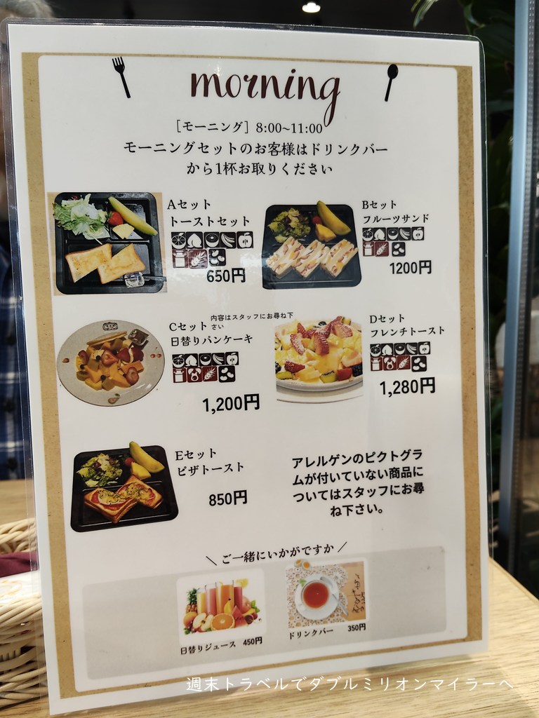 さて、果実園のモーニングは、毎日8~11時までのサービス、A~Eの5種類のメニューはフルーツが盛りだくさんで、いずれもドリンク1杯付き。以前よりもお値段が上がったメニューもありますが、まだまだお得感があります。