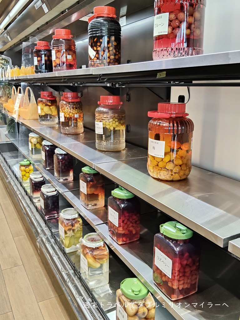 店内を見渡すと、以前いちごの苗が飾られていたケースの中には、果実酒(果実ジュース?)を漬ける瓶が飾られていました。