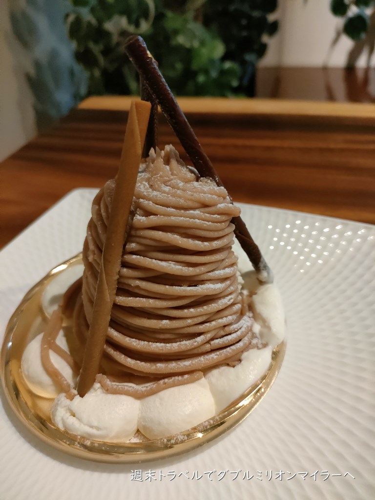 棒状のチョコレート3本が乗っているモンブランは、テントを張っているようにも思います。栗クリームの下には生クリーム、栗の甘露煮、カスタードクリーム、スポンジが入ったもの、台の部分には生クリームの飾りがついています。
