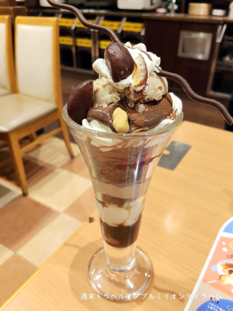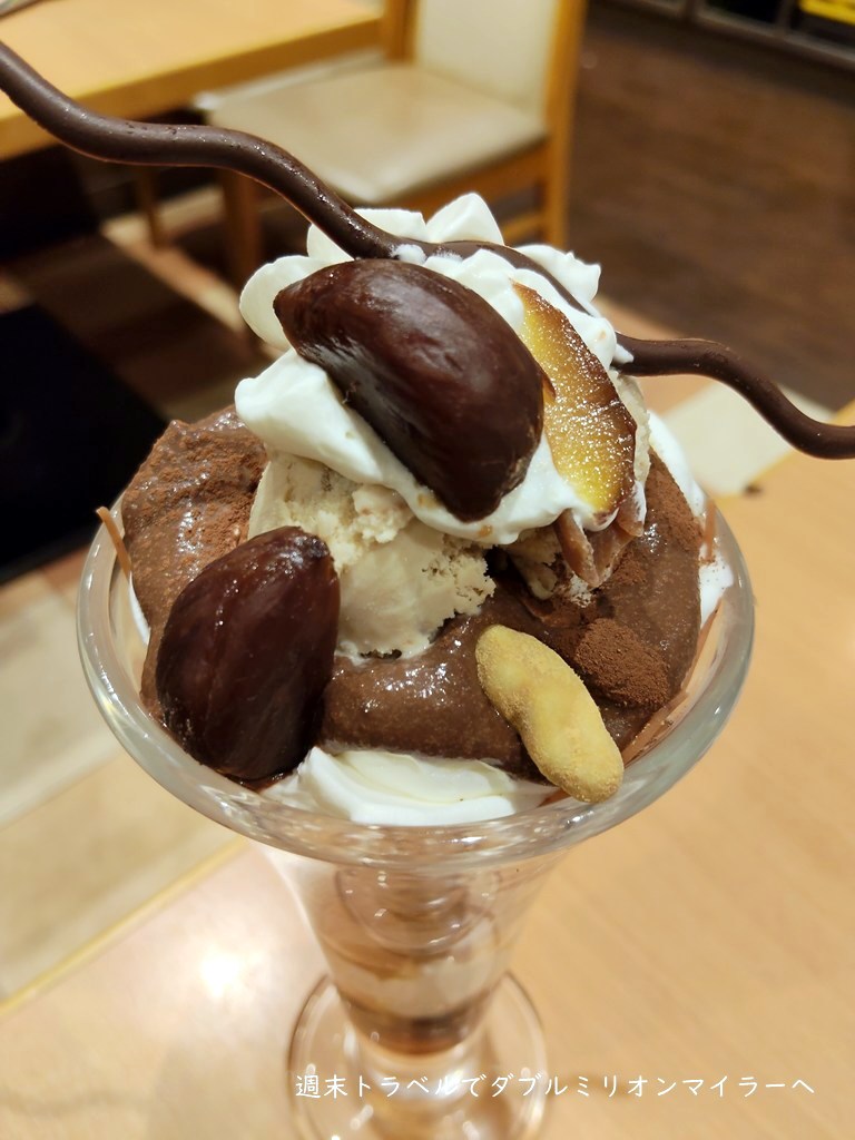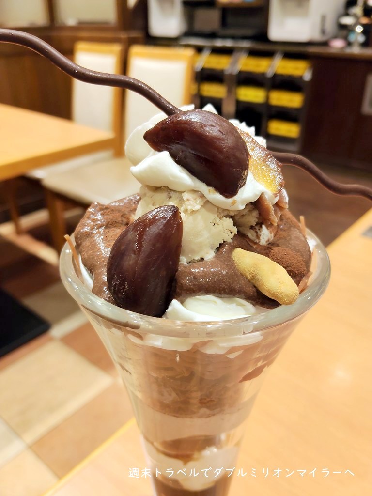 妻は、豪華なビッグパフェ「マロンとショコラのパフェ」を選びました。見た目からすでに華やかです。