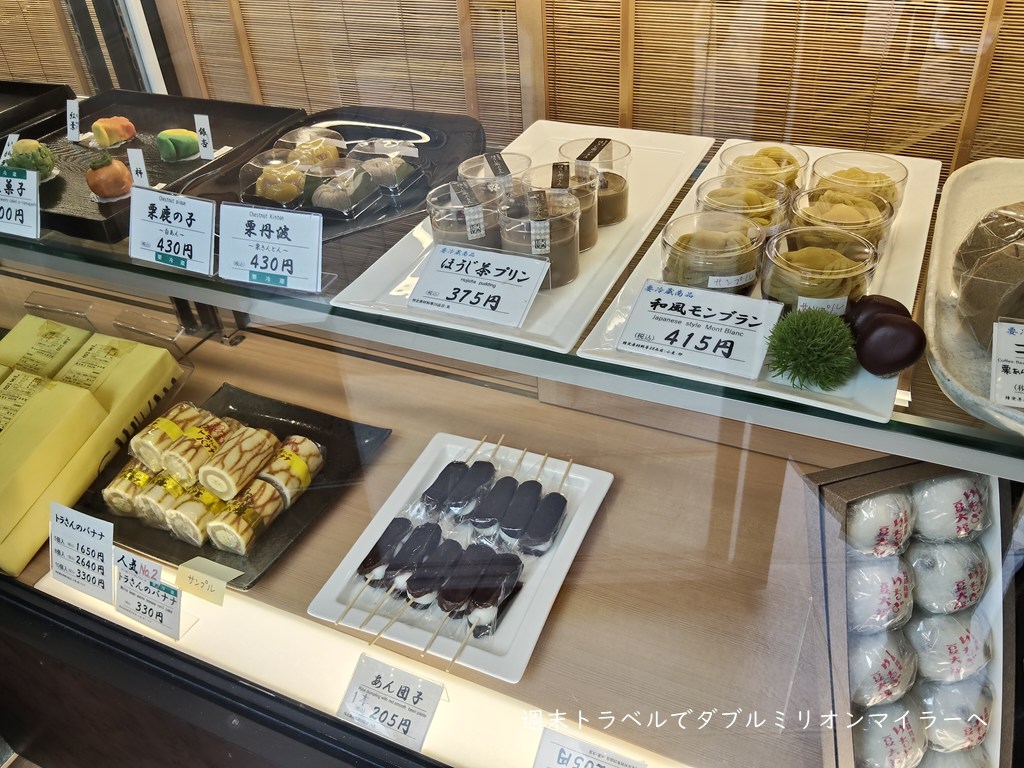 表に看板が出ていた「和風モンブラン」もあります。栗かのこや栗羊羹などを見ると目移りしてしまいますが、せっかくなので初志貫徹で「和風モンブラン」を購入しました。