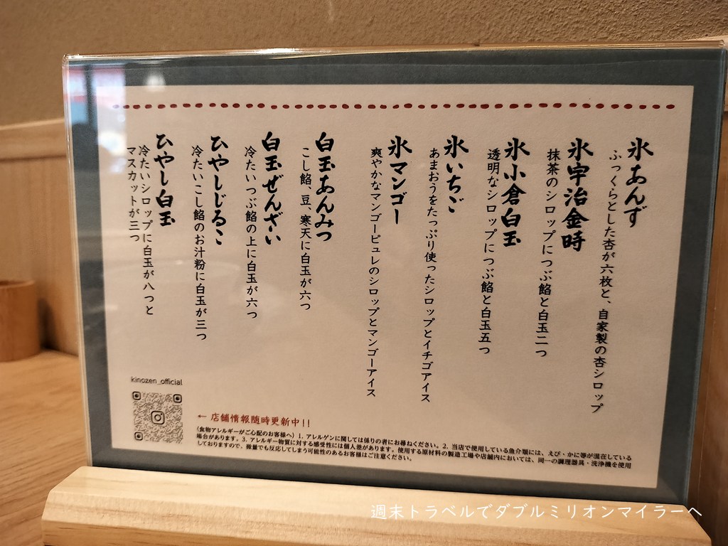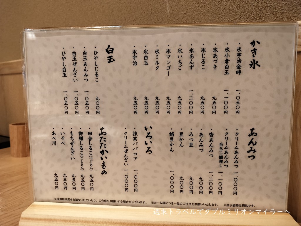 テーブルの上のメニューです。夏は冷たいものと氷と冷やしじるこや白玉などが紹介されています。