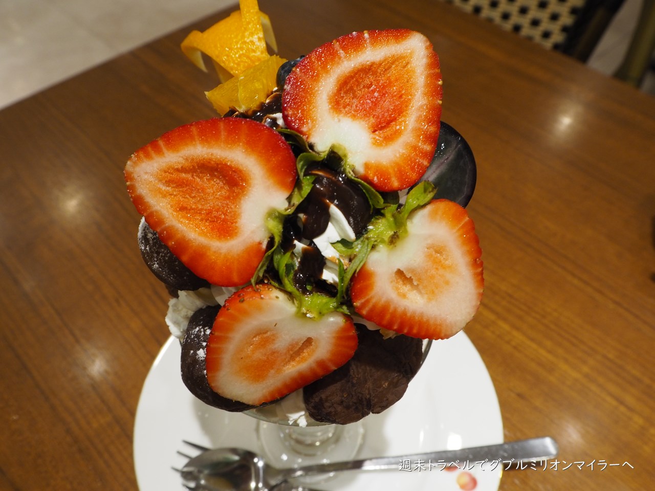 最初に驚いたのは、フルーツの甘さ。チョコレートやアイスクリームと一緒にいただくとフルーツの甘味が感じられなくなるのが普通ですが、「果実園」のフルーツはアイスクリームに負けない甘さ、特に巨峰が甘くて驚きました。