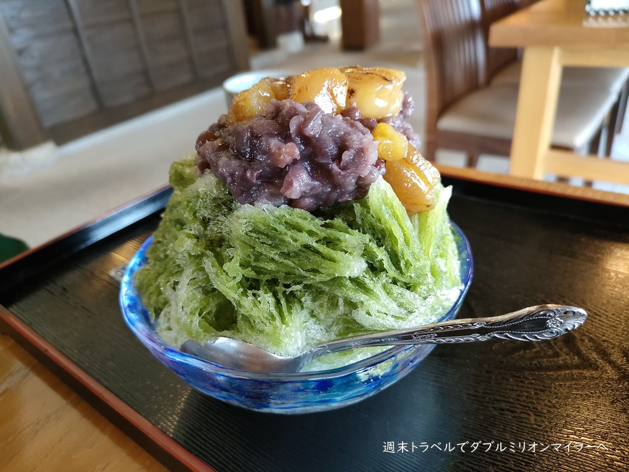 かき氷には、全体に、抹茶蜜がかかっていて、上には小豆と栗が乗っています。抹茶蜜がかかっているのは意外。いわゆる宇治金時に栗がのったかき氷です。