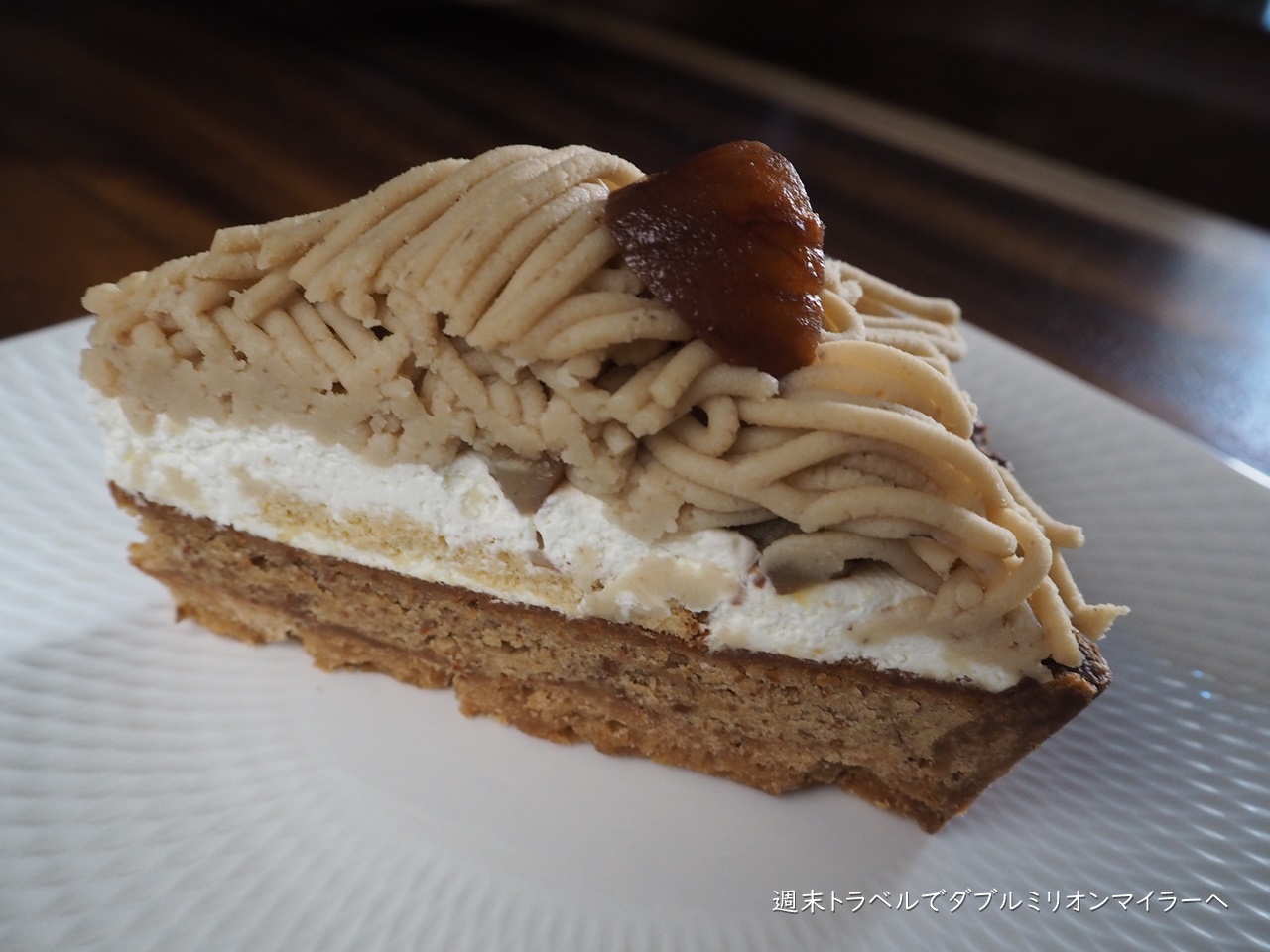 生クリーム、スポンジケーキ、そしてマロンペーストの組み合わせ、生クリームとマロンペーストの間にはクラッシュマロンがたくさん入っていて、栗をそのまま味わえるようにもなっています。
