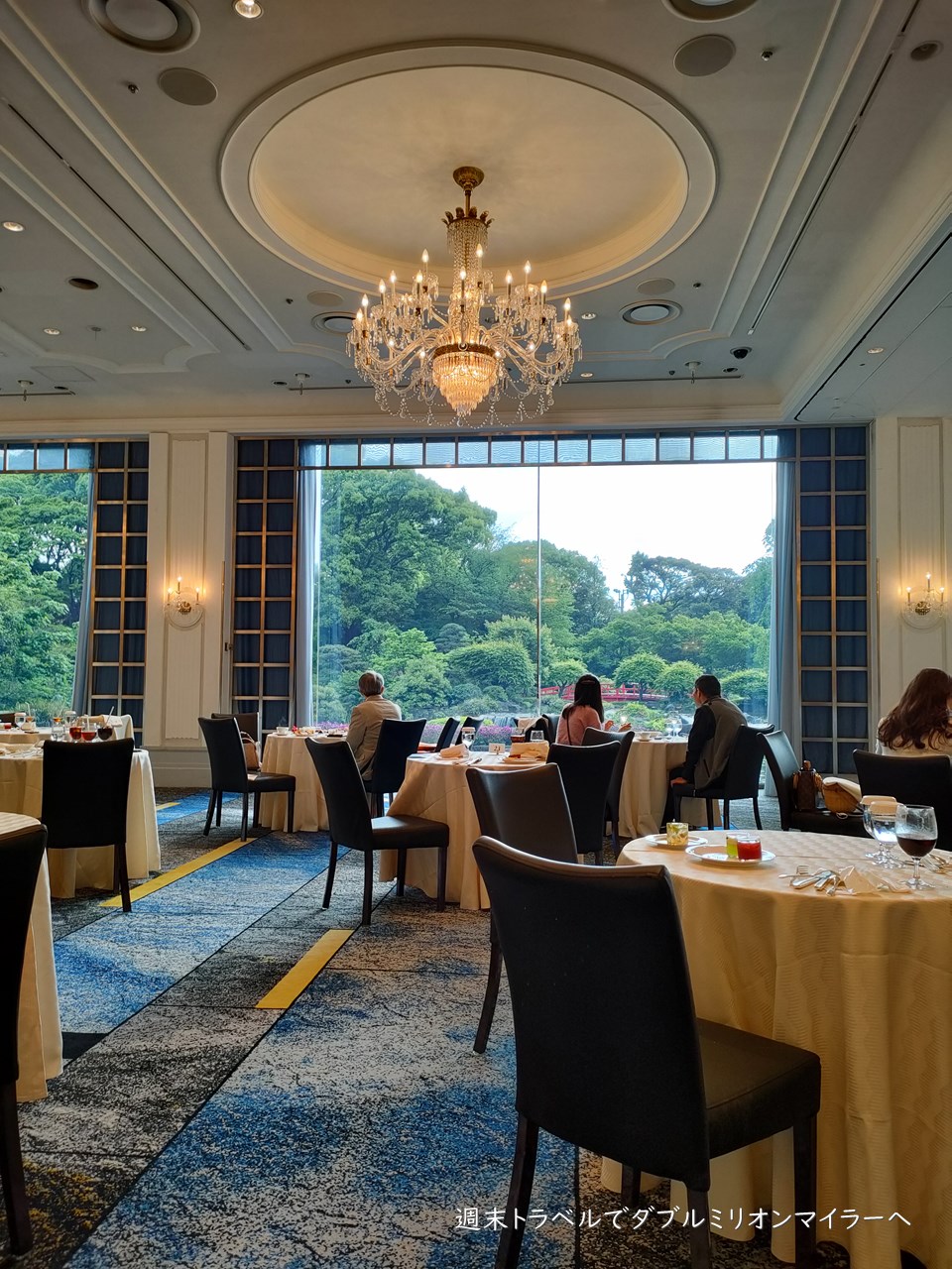 我が家がアサインされた席は4列目。庭園側からは遠いですが、ビュッフェ台には近い場所。ビュッフェ台が近いとはいっても、テーブル間隔が広くゆとりがある配置でしたので、騒々しさはなく、落ち着いて楽しめました。