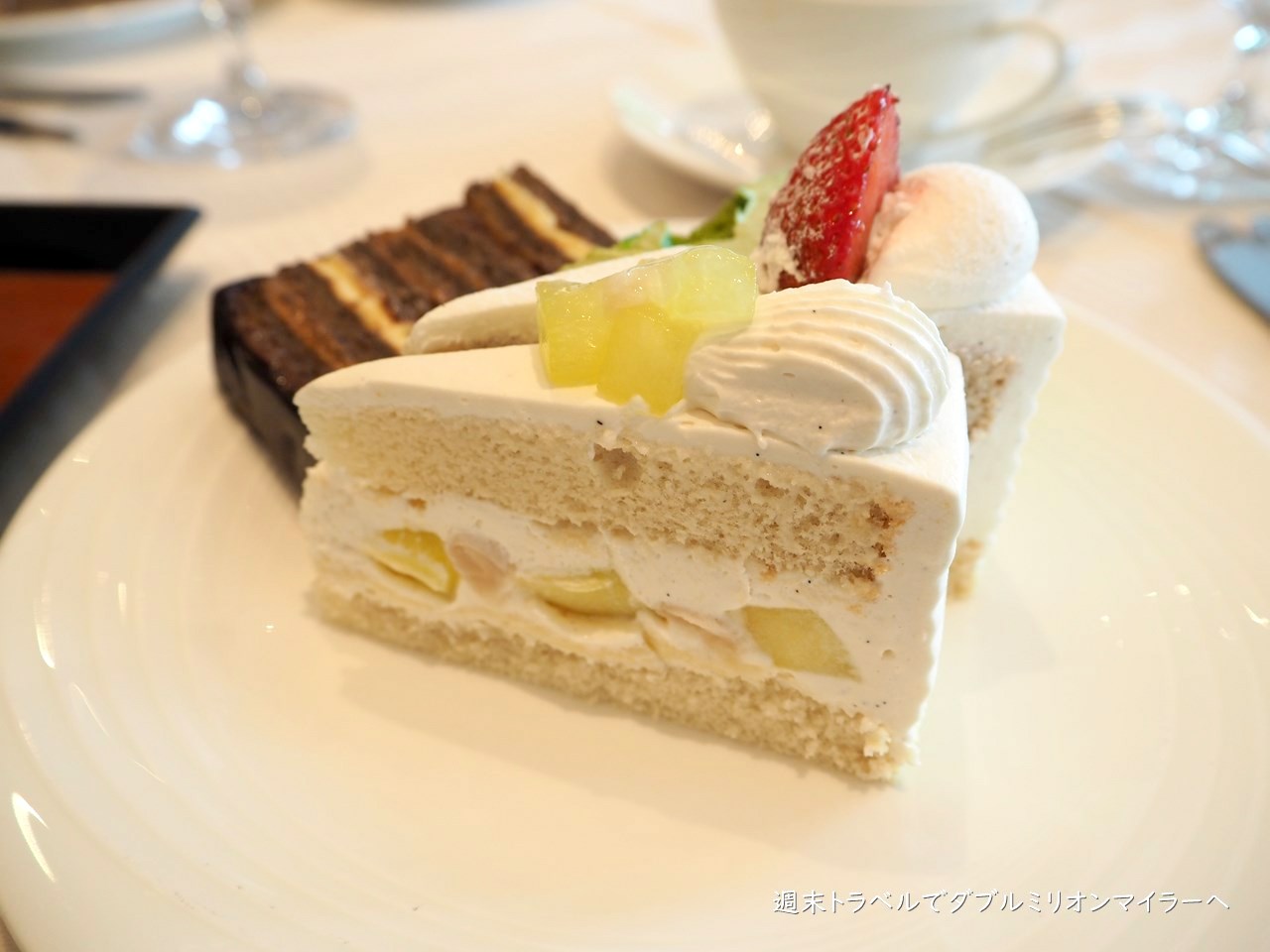 パティシエさんが取り分けてくださるのですが、スイーツを直立させてるのが難しかったり、スイーツ上の飾りが落ちてしまったりと、なかなか美味しそうな絵にならないのが残念。