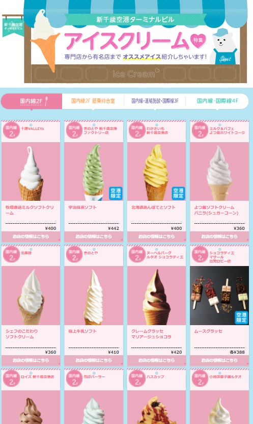 新千歳空港のお楽しみは、北海道の味覚のランチだけでなく、乳製品を使ったスイーツ。新千歳空港のホームページをみると、国内線ターミナルビルの中だけでも20種類以上のソフトクリームがあります。