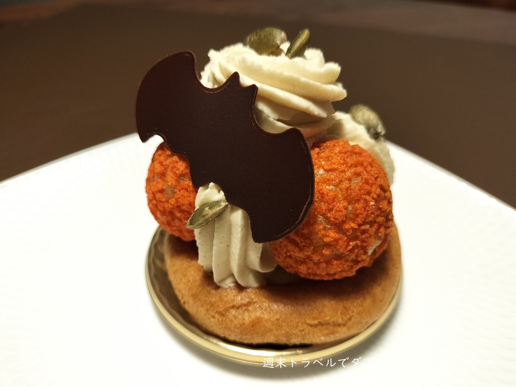 かぼちゃクリームとキャラメルクリームをシュー生地に合わせた秋らしい季節のケーキ。ハロウィンらしく、こうもりのチョコレートが飾られています。