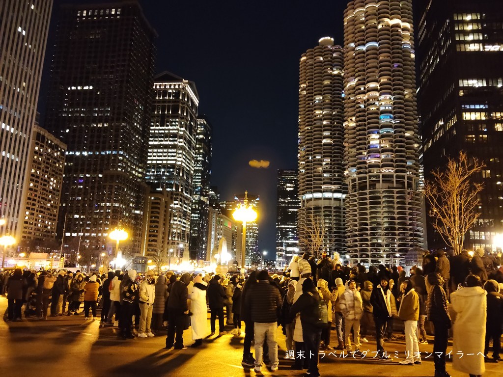 そんな寒さの中でも、NewYear花火を見ようと多くの方がシカゴリバー沿いに集まってきました。皆さん帽子、手袋、ダウンと完全防備で0時を待ちます。