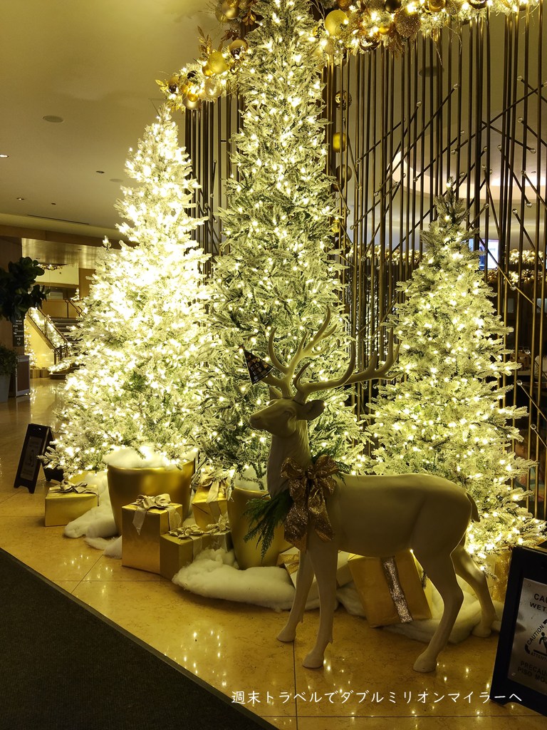 ホテルのロビーは金色のツリーが輝き、ゴージャスな雰囲気。
