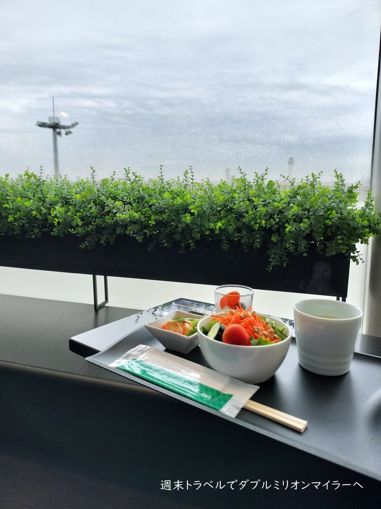 - 羽田空港第3ターミナルからの出発、搭乗前に、ANAスイートラウンジで夕食を